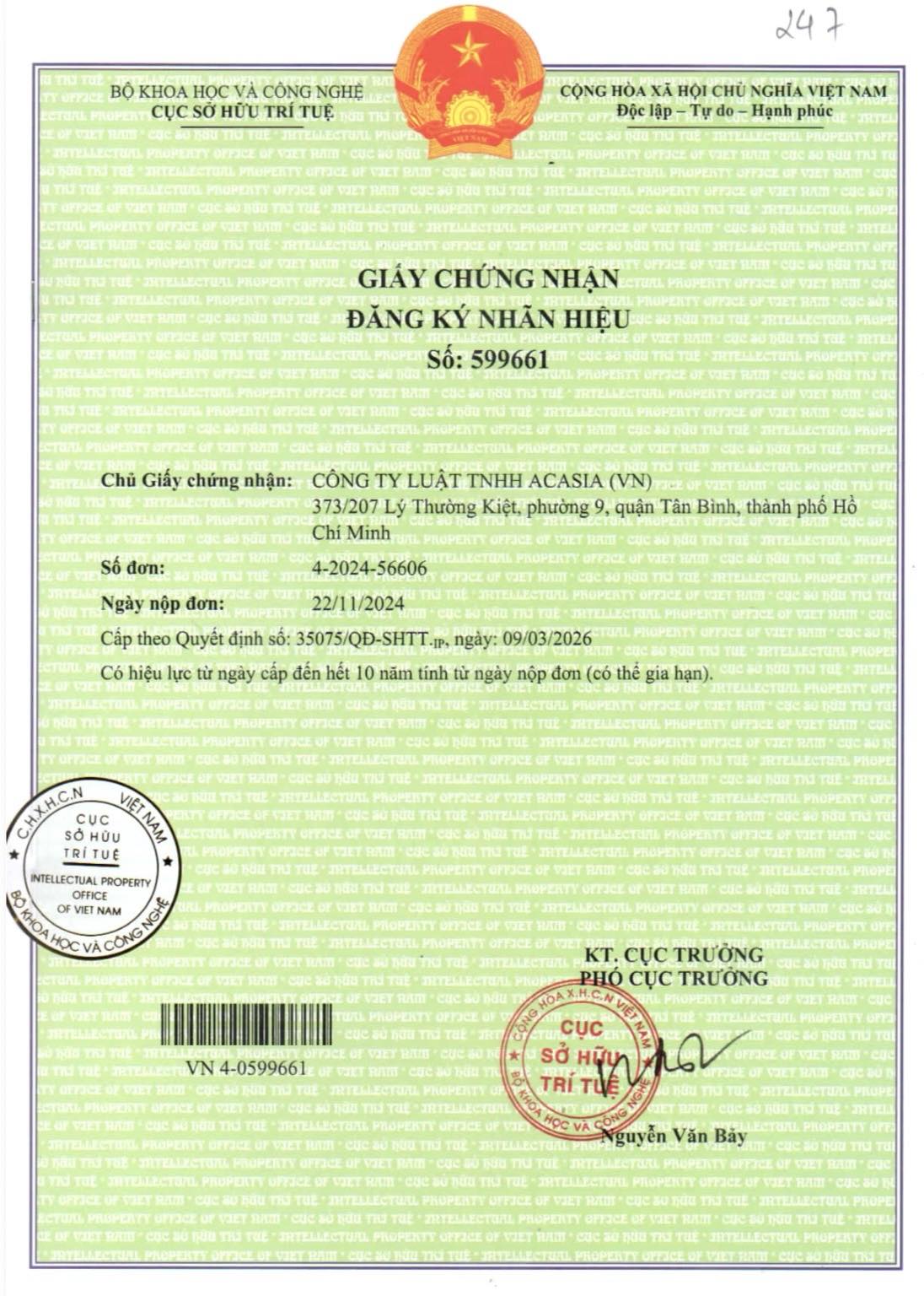 Nhãn hiệu ACASIA đã chính thức nhận được Giấy chứng nhận đăng ký từ Cục Sở hữu trí tuệ - một dấu mốc khẳng định quyền sở hữu và sự hiện diện vững chắc của chúng tôi trên thị trường pháp lý.